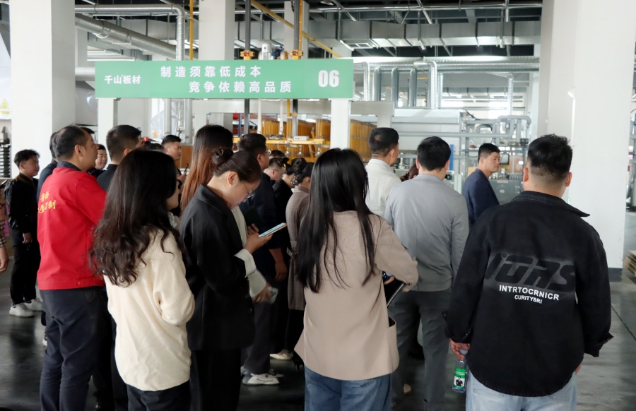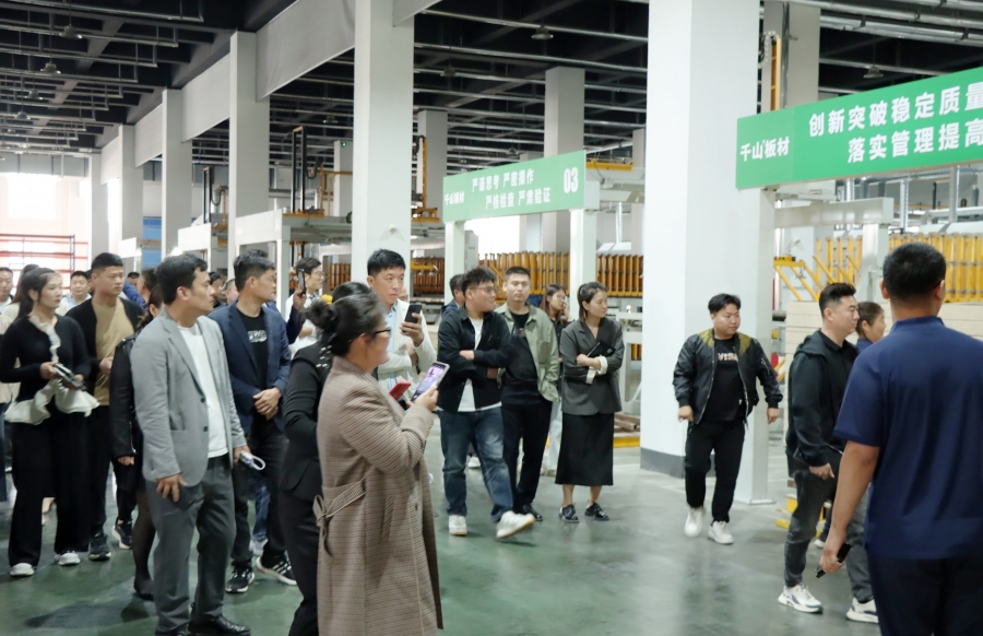 學(xué)習(xí)會結(jié)束后,王殿忠經(jīng)理帶領(lǐng)大家參觀了千山的現(xiàn)代化生產(chǎn)工廠,從板材品類、生產(chǎn)工序、檢驗出廠等方面深入了解板材生產(chǎn)環(huán)節(jié)。