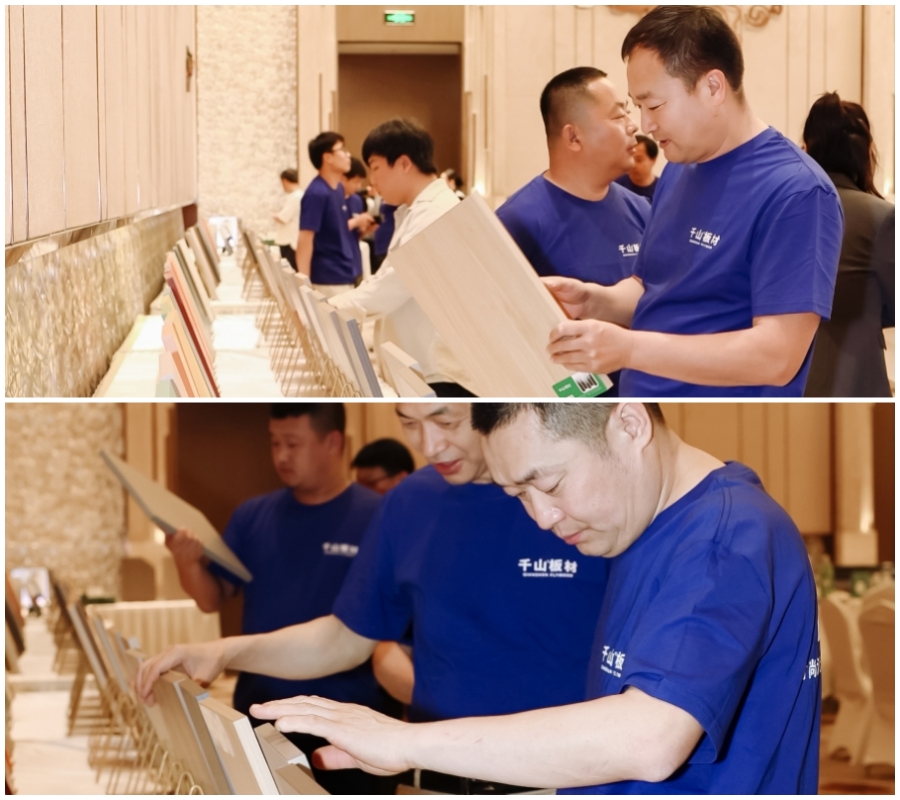 下午5點,合作伙伴們陸續(xù)到達活動現(xiàn)場,在千山板材風采展示墻簽到并合影留念。隨后,伙伴們來到千山板材樣品展示區(qū),仔細參觀2024款系列產(chǎn)品。