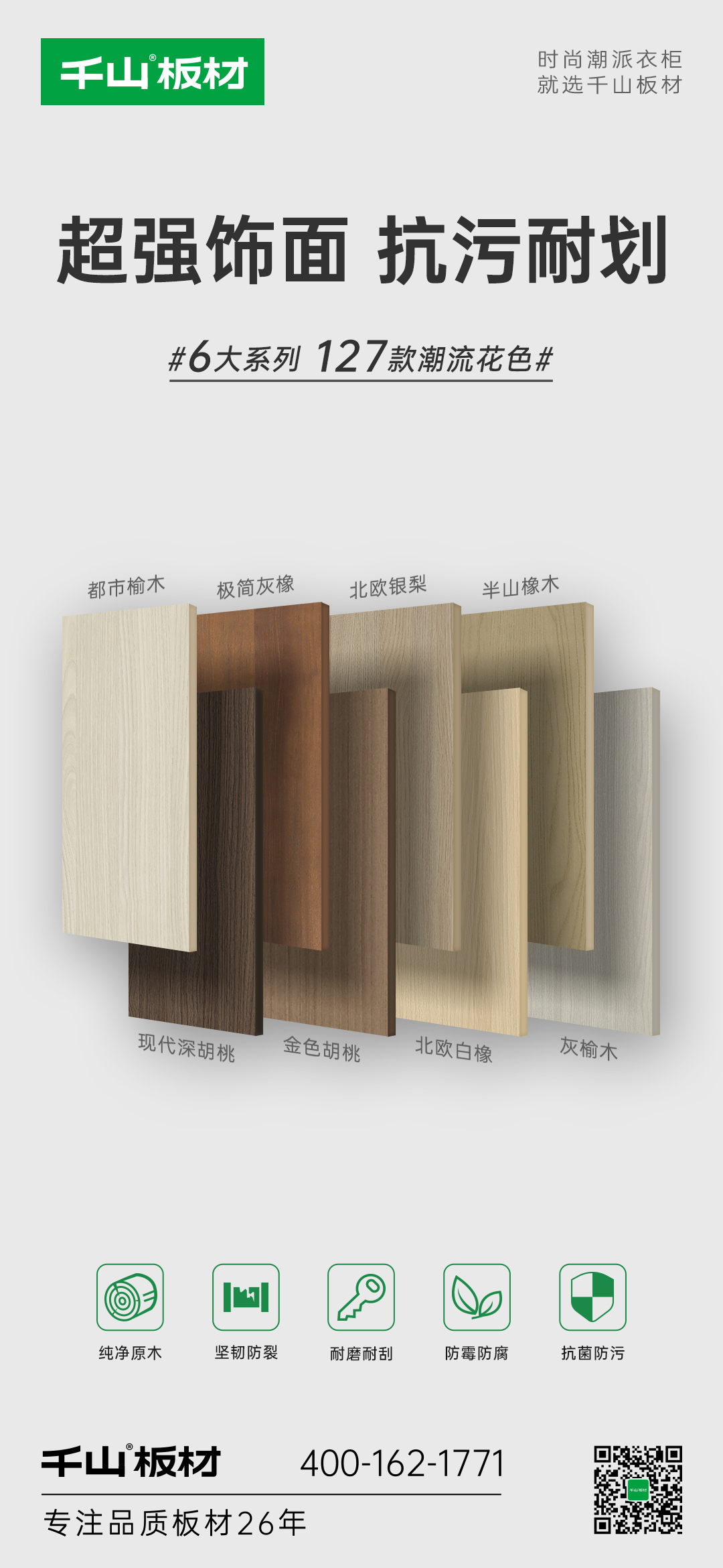 6大系列127款潮流花色涵蓋木紋系列32款、純色系列41款、高定系列10款、數(shù)碼系列24款、布紋石紋系列8款、門板系列12款,滿足多樣化的裝修風格。
