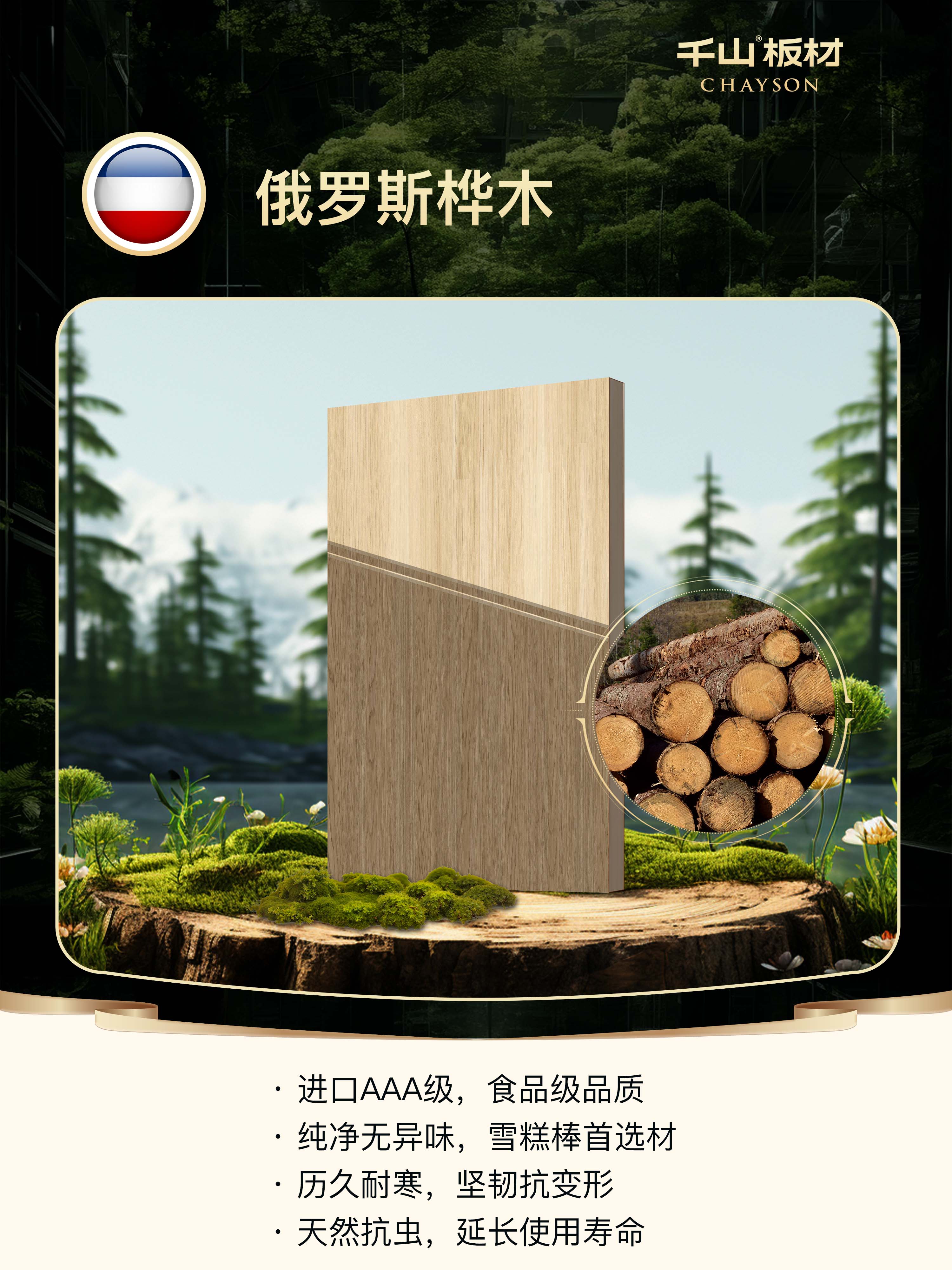 俄羅斯樺木生長在寒冷的環(huán)境中,具有更高的密度和硬度,結(jié)構(gòu)致密、材質(zhì)堅(jiān)韌,是制作雪糕棒、木砧板等食品用材的理想材料,健康且耐磨耐用。