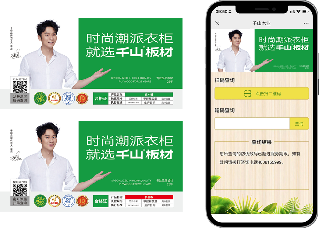 刮開涂層,掃描千山防偽商標(biāo)二維碼,關(guān)注微信公眾號(hào)(千山板材),點(diǎn)擊防偽查詢,輸入16位或20位防偽碼。